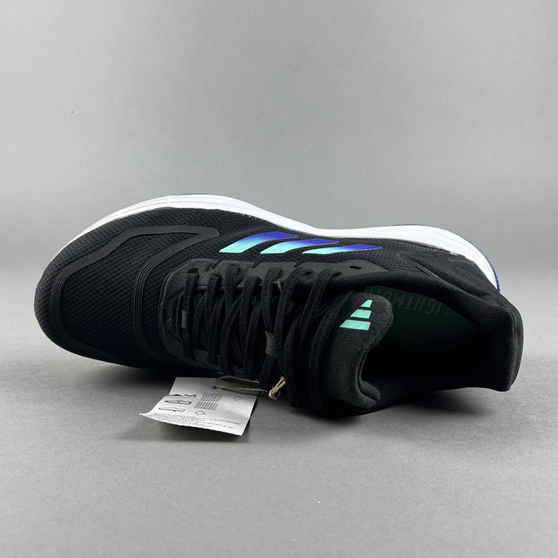 این مدل در رنگ مشکی با سه خط شاخص آدیداس در طیف رنگی آبی و فیروزهای عرضه شده که ترکیبی زیبا و جذاب ایجاد کرده است. زیره سفید با لبههای آبی تیره، ظاهر اسپرت و شیکی به کفش داده است که به راحتی با لباسهای ورزشی هماهنگ میشود. -