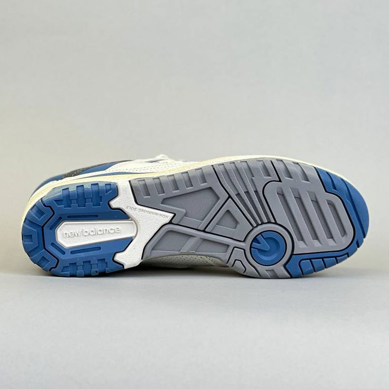نسخهای که اینجا میبینید، با رنگبندی خاص سفید، آبی کلاسیک و طوسی تیره طراحی شده است. رنگ سفید، حس تمیزی و سادگی را به کفش میدهد؛ آبی کلاسیک، روحیه ورزشی و پرانرژی آن را نشان میدهد؛ و طوسی تیره، استحکام و اصالت را کامل میکند. جالب اینکه لبه میانی کفش با رنگ کرم وینتیج (Vintage Cream) ساخته شده تا حالوهوای کفشهای کلاسیک دهه 80 را تداعی کند.