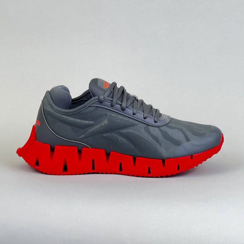 طراحی مدرن با رنگ خاکستری و زیره قرمز زیگزاگی.