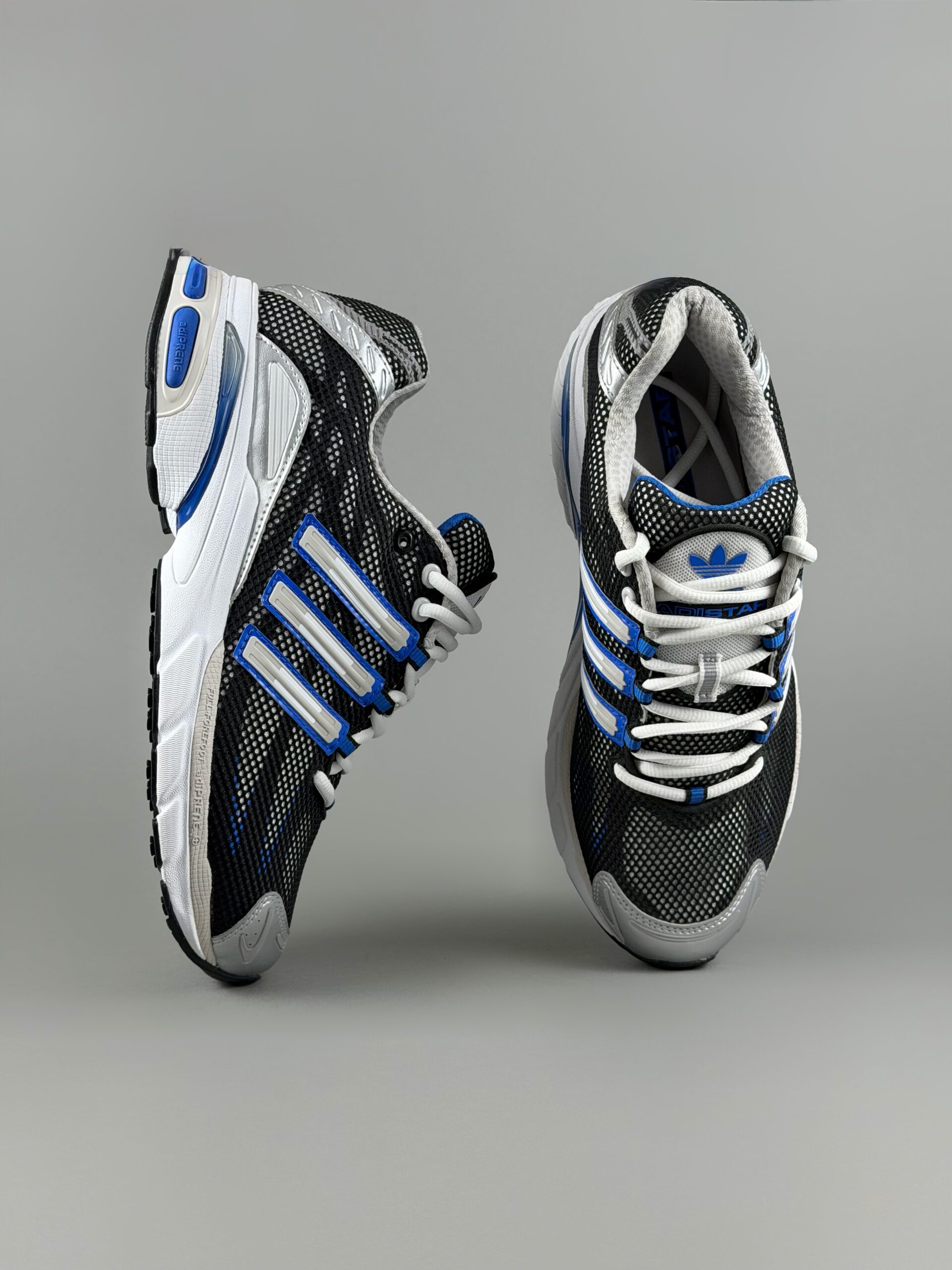 لوگو: سه خط شاخص آدیداس در کنارهها با ترکیب رنگ نقرهای و حاشیه آبی، ظاهر کفش را متمایز میکند.
